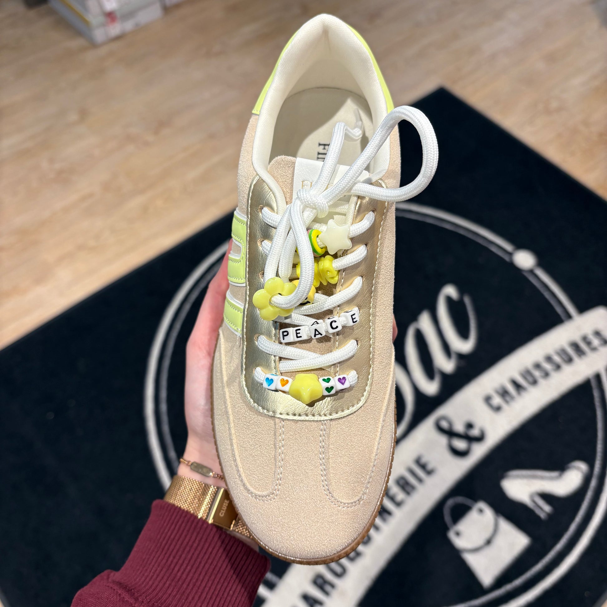Ces baskets au style rétro revisité associent un beige doux, des bandes jaunes et une semelle caramel pour un look frais et tendance. Les lacets décorés de petits charms colorés apportent une touche fun et originale, parfaite pour twister une tenue simple. Confortables et faciles à porter, elles deviendront vite un indispensable du quotidien.