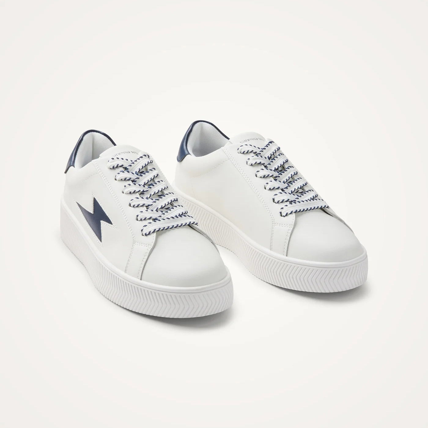 - Découpe en forme d'éclair et patch arrière en similicuir bleu marine